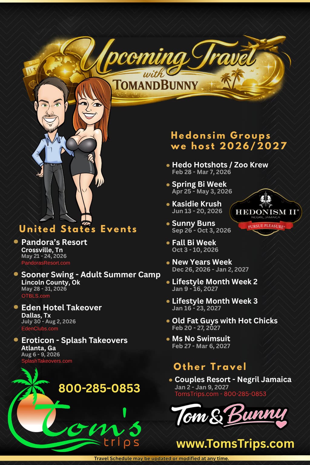 TomandBunny, Tom’s Trips, adult lifestyle travel, swinger travel, lifestyle resorts, Hedonism II Jamaica, Desire Resort Cancun, Temptation Cancun, adult cruises, lifestyle cruises, Bliss Cruise, LLV Cruise, sex positive travel, nude travel, clothing optional travel, swinger community, swinger dating sites, Kasidie, SDC, PartnersID, lifestyle jewelry, upside down pineapple necklace, swinger matchmaking, adult only vacations, swinger forums, swinger profiles, swinger vlogs, swinger podcasts, swinger blogs, swinger video tours, lifestyle couples, lifestyle events, lifestyle networking, lifestyle websites, lifestyle communities, adult vacation planning, swinger vacation packages, swinger meetups, global swinger community, connect with couples, connect with singles, free swinger trials, no credit card needed, adult social media platforms, lifestyle tips, lifestyle education